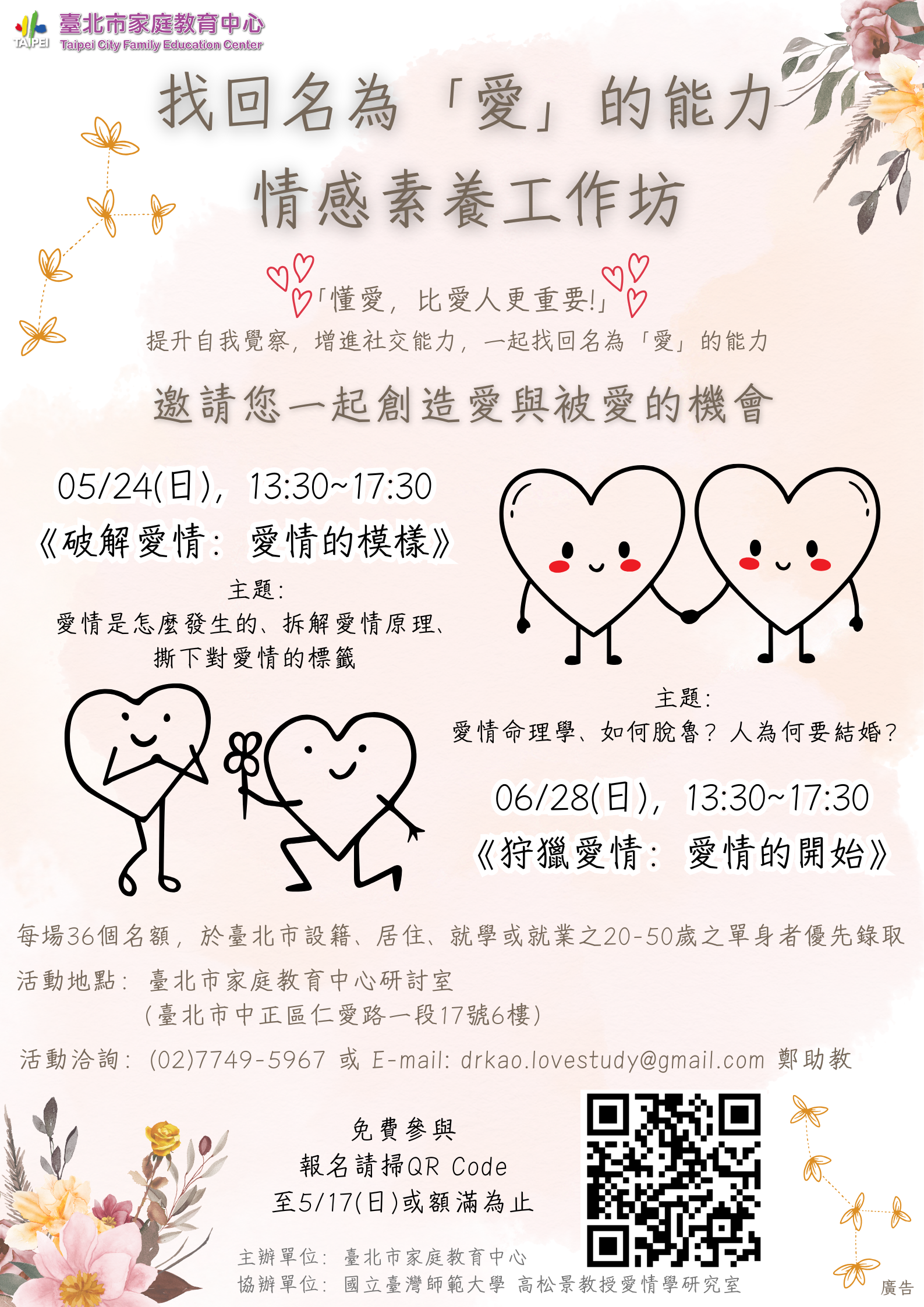 三、詳細內容可於中心網站 (https://family.gov.taipei)課程與活動瀏覽及下載, 相關報名問題請寄E–mail至drkao.lovestudy@gmail. com詢問。