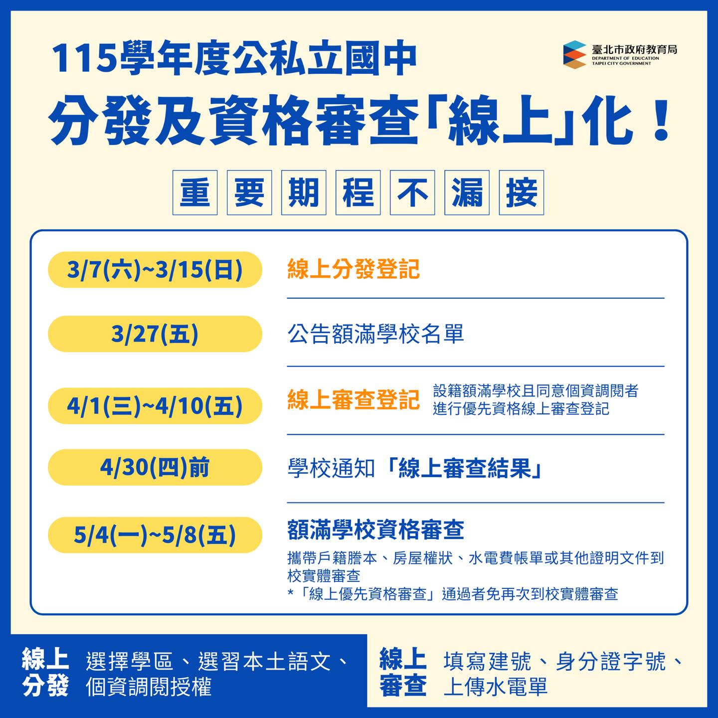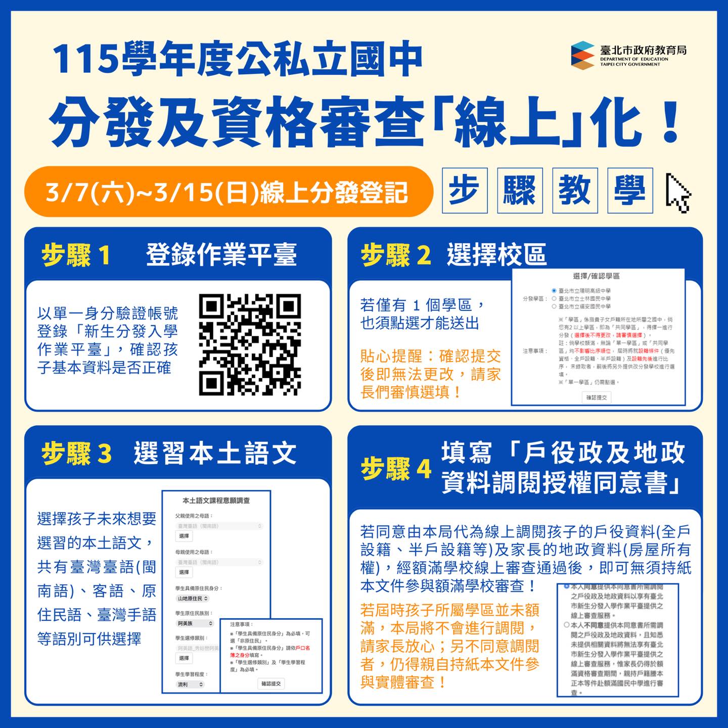 從分發登錄、資格審查到後續報到,皆可採線上方式辦理,在家即可完成重要入學程序,省時又便利